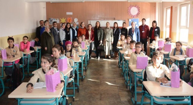 50. Yıl Ortaokulu’nda bere, atkı ve okuma kitabı dağıtımına Nilgün Azizoğlu, Yakutiye Kaymakamı Dr. Ahmet Naci Helvacı’nın eşi Kafiye Helvacı, İl Jandarma Komutanı Kıdemli Albay Mustafa Çelik’in eşi Nadire Çelik ve kampanyaya katkı sağlayan diğer hanımlar katıldı. Sınıfları dolaşarak çocuklara berelerini veren Nilgün Azizoğlu, onlarla sohbet etti.