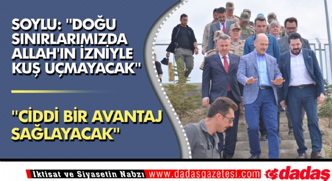 İçişleri Bakanı Süleyman Soylu, Doğubayazıt'ta yapımı süren sınır duvarlarının önemli olduğunu belirterek, "Bir tarafta sınır fiziki sistemi dediğimiz bu duvarlar, diğer taraftan da kameralar, aynı zamanda aydınlatmalar ve bazı yerlerdeki sınır fiziki sistemlerinin hemen önüne konulan su kanallarıyla birlikte doğu sınırlarımızda Allah'ın izniyle kuş uçmayacak." dedi.
