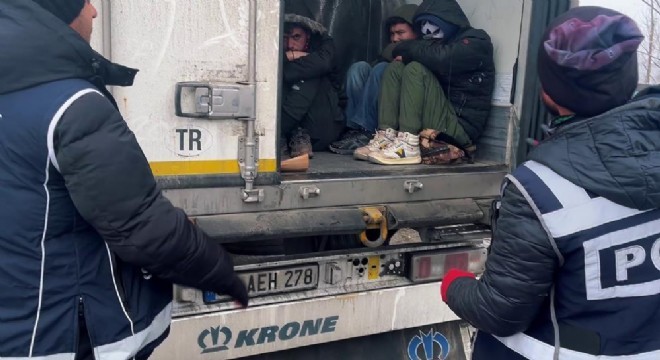 Erzurum'da polisin yaptığı denetimlerde bir tırın mühürlü dorse kısmında 23, kamyonet aracın kasa kısmında saman balyalarıyla gizlenmiş vaziyette 11 ve otomobil içinde 3 kaçak göçmen yakalandı.