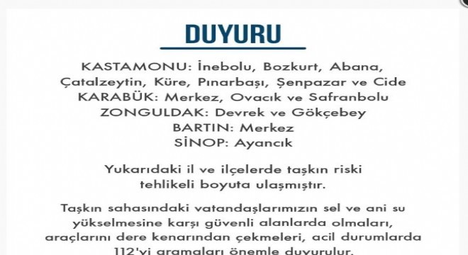 Meteoroloji Genel Müdürlüğünden alınan bilgilere göre, Batı Karadeniz’de halen yerel kuvvetli olarak devam eden sağanak yağışların; Pazar gece saatlerinden itibaren etkisini artırarak, 27 Haziran Pazartesi günü 23.59’a kadar, Batı Karadeniz genelinde çok kuvvetli, Karabük, Zonguldak, Düzce ve Kastamonu çevreleri ile Sinop’un iç ve batısında yer yer şiddetli, Bartın çevreleri, Kastamonu’nun kuzeyi, Karabük’ün kuzey ve batısı, Sinop’un batısı, Zonguldak’ın iç kesimleri ile Düzce’nin batısında yer yer aşırı olacağı öğrenildi. AFAD, bu yağışların sonucunda meydana gelebilecek ani sel, su baskını, heyelan, yağış anında kuvvetli rüzgar ve ulaşımda aksamalar gibi olumsuzluklara karşı dikkatli ve tedbirli olunması konusunda vatandaşlara uyarıda bulundu.