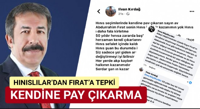 Erzurum'un 4 güney ilçesinden yalnızca Hınıs’ta AK Partinin seçimleri kazanması bölgede tartışmaları da beraberinde getirdi. Aslen Tekmanlı olan AK Parti Milletvekili Abdurrahim Fırat’a tepki gösteren Hınıslı seçmenler, “Bu başarıyı sakın ola kendi üstüne almayasın. Bu başarı Hınıs halkının başarısıdır. Sizin Hınıs’a en küçük bir katkınız olmamıştır” diyerek tepki gösterdiler.