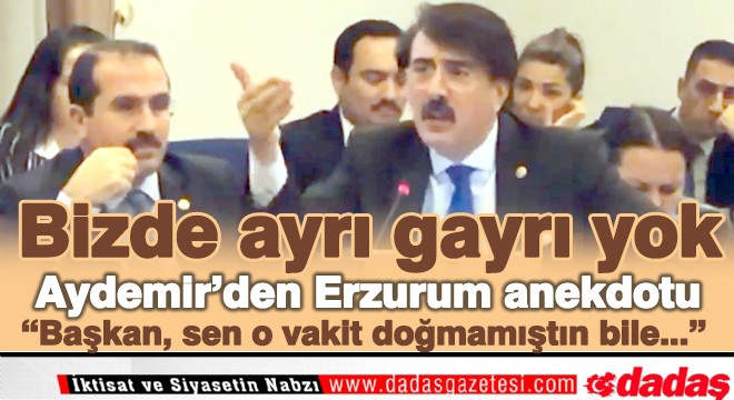 Milletvekili Aydemir, Erzurum’da geçen bir olayı paylaşarak, ‘“Nutuk olsun” diye demişken müsaade ederseniz bir de renk olsun diye Erzurum’da yaşanmış -darbımesel değil, hikâye değil- bir hâli aktarayım, bir renk olsun. Erzurum’da bir belediye başkanı, böyle, konuşmayı, sohbeti biraz geri planda tutmuş, o noktada noksanı olan birisi. Hemen hemen her bayram konuşmasını, önceden hazırlanmış ve yıllara sâri, çok uzun yıllardan beri hep aynısını yaparak götürüyormuş. Naile diye de yarı meczup bir kadın, bunun akranı. Gene nutuk irat ediyor, o arada kendinden çok çok önceki yaşanmışlığın sanki birinci derecede aktörüymüş gibi olayı anlatıyor ama Naile dayanamıyor ” diyor. Başkan birincisinde sükût ediyor, bir daha aynı ikaz, bir daha gelince başkan artık dayanamıyor “Naile, kızım, bu bir nutuktur, dinle sen.” diyor. Şimdi, burada da muhalefetin söylediklerini hakikat dozu, payı, katsayısı düşük nutuklar olarak gördüm ben. ‘ nitelemesini yaptı.