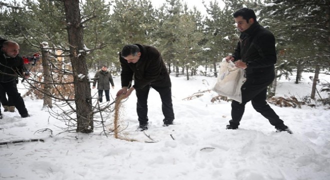 Erzurum Valisi Mustafa Çiftçi, bir grup doğaseverle Yakutiye ilçesindeki Köşk Göleti çevresinde yaban hayvanlarına yem bıraktı.
