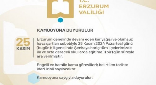Açıklamada, ‘Erzurum genelinde devam eden kar yağışı ve olumsuz hava şartları sebebiyle 25 Kasım 2024 Pazartesi günü (bugün); il genelinde Şenkaya hariç tüm ilçelerimizde ilk ve orta dereceli okullarda eğitime 1(bir) gün süreyle ara verilmiştir.