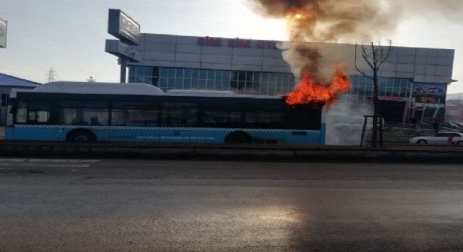 Erzurum’da şehir içi yolcu taşımacılığı yapan otobüs, seyir halindeyken motor bölümünden alev aldı.