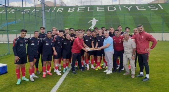 U19 Milli Takımımızın hazırlık kampı Erzurum'da tüm hızıyla sürüyor. Erzurum Büyükşehir Belediyesi Yüksek İrtifa Kamp Merkezi'nde çalışmalarını gerçekleştiren Millilerin kampı 6 Ağustos Cuma günü sona erecek. Teknik Direktör Mehmet Yıldırım yönetimindeki Ay-yıldızlı ekibin kampını ziyaret eden Gençlik ve Spor İl Müdürü Fuat Taşkesenligil ile Spor Şube Müdürü Güngör Şenses, U19 Yaş Millilere moral verdiler. Teknik Heyet ve futbolculara baklava ikram eden Taşkesenligil, genç yıldızlara Avrupa Arenası’nda başarı dileklerini iletti.