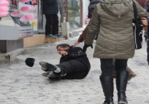 Buzlu zeminde düşen vatandaşlar ilginç görüntü oluştururken, yaralanmadan kazaları atlattı.