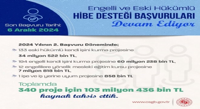 Çalışma ve Sosyal Güvenlik Bakanı Vedat Işıkhan, engelli ve eski hükümlü hibe desteği başvurularına ilişkin sosyal medya hesabından açıklamalarda bulundu. Buna göre 2024 yılının ikinci döneminde 133 eski hükümlü kendi işini kurma projesine 34 milyon 522 bin lira, 194 engelli kendi işini kurma projesine 60 milyon 238 bin lira, 12 engellilere yönelik mesleki eğitim kursu projesine 7 milyon 818 bin lira, 1 işe ve iş yerine uyum projesine 858 bin lira ve toplamda 340 proje için 103 milyon 436 bin lira kaynak tahsis edildiğini belirtti. Bakan Işıkhan, açıklamasında şu ifadelere yer verdi: