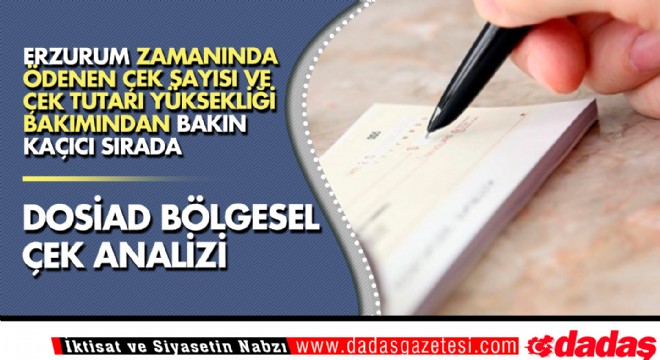 TBB verileri üzerinden Doğu Anadolu Sanayici ve İşadamları Derneği (DOSİAD) tarafından gerçekleştirilen analize göre Haziran ayında Erzurum’da 4 bin 434, KUDAKA istatistik Bölgesi illerinde 6 bin 326, Kuzeydoğu Anadolu İstatistik Bölgesinde 11 bin 219, Doğu Anadolu Bölgesinde 29 bin 74 çek zamanında ödendi. Yılın ilk altı ayında ise Erzurum’da 52 bin 999, KUDAKA İstatistik Bölgesi illerinde 72 bin 106, Kuzeydoğu Anadolu istatistik Bölgesi illerinde 126 bin 821, Doğu Anadolu’da ise 340 bin 83 çek ödemesi gerçekleşti.