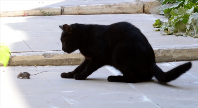 Zaman zaman ağzıyla taşıdığı küçük hayvanı öldürmeyen kedi, patisiyle tutup ağzıyla taşıdığı fare ile uzun süre oynadı.