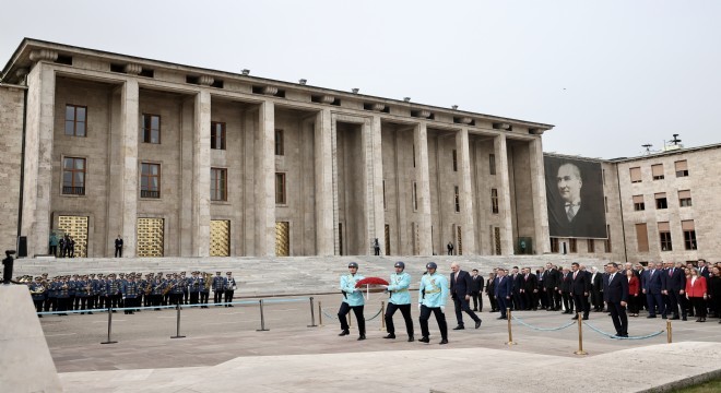 TBMM Başkanı Kurtulmuş'un Gazi Mustafa Kemal Atatürk’ün mozolesine çelenk bırakmasının ardından saygı duruşunda bulunuldu ve İstiklal Marşı okundu.