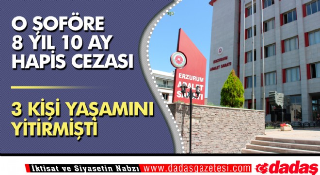 Erzurum'un Köprüköy ilçesinde 3 kişinin yaşamını yitirdiği trafik kazasına ilişkin davada yargılanan tır şoförüne "taksirle öldürme" suçundan 8 yıl 10 ay 20 gün hapis cezası verildi.