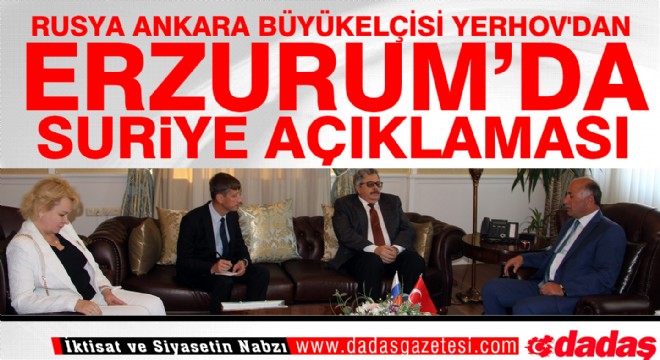 Erzurum Valiliğini ziyaret eden Rusya Ankara Büyükelçisi Aleksey Yerhov, “Karşılıklı olarak Suriye’de barışın bir an evvel olması için çok ciddi gayretler sarf ediyoruz. Fakat henüz barış noktasına gelemedik ve muhtemelen daha da zayiat vermeye devam edeceğiz” dedi.