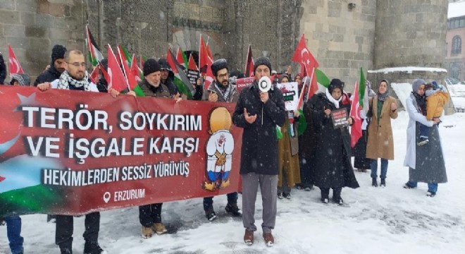 Erzurum'da görev yapan sağlık çalışanları kar yağışı altında İsrail'in Gazze'ye yönelik saldırılarını protesto etmek için "sesiz yürüyüş" yaptılar.