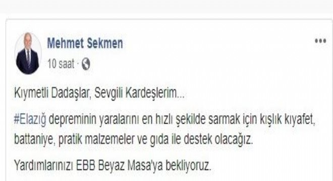 Erzurum Büyükşehir Belediye Başkanı Mehmet Sekmen, Elazığ ve Malatya depremzedeleri için sosyal medya üzerinden yardım kampanyası başlattı.