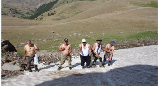 Oltulu doğa severler Gacerti Dağı'ndaki kar kütlesinde kar banyosu yapıp bazalt taşlarında enerjilerini tazelediler. Temmuz ayında kayak keyfini yaşayarak güzel bir gün geçirdiler.