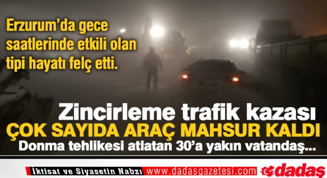 Erzurum’da gece saatlerinde etkili olan tipi hayatı felç etti. Kar ve tipi nedeniyle yüksek kesimlerde birçok güzergâh ulaşıma kapandı. Yoğun yağış ve tipi nedeniyle Erzurum - Bingöl karayolunda çok sayıda zincirleme trafik kazası meydana geldiği, araç sürücülerinin ve vatandaşların mahsur kaldığı ihbarı İl Kriz Merkezine bildirildi. Bunun üzerine bölgeye sevk edilen Karayolları ve Büyükşehir Belediyesi Kırsal Hizmetler Daire Başkanlığı ekipleri ile AKUT çalışanları mahsur kalanlara ulaştı. Aralarında hamile kadınlarında bulunduğu, donma tehlikesi atlatan 30’a yakın vatandaş kurtarılarak Karayolları 12. Bölge Müdürlüğüne ait Çat Bakımevine ulaştırıldı.
