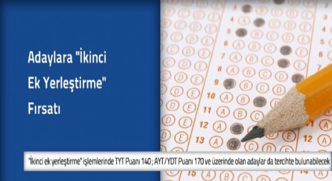 Buna göre ikinci ek yerleştirme işlemleri sürecinde TYT puanı 140 ve üzerinde olan adaylar ‘önlisans programlarında’, AYT/YDT Puanı 170 ve üzerinde olan adaylar ‘lisans programlarında’ boş kalan kontenjanlara tercihte bulunabileceklerdir.”