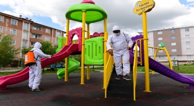 Yakutiye Belediyesi koronavirüsle mücadele ekipleri, yarın dışarı çıkacak olan çocuklar için ilçe merkezinde bulunan parklardaki çocuk oyun elemanlarını dezenfekte etti.