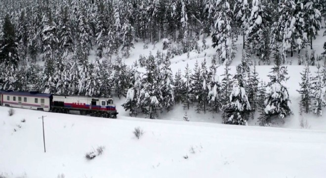 Kars civarında karla kaplı dağların arasından kıvrılarak ilerleyen trenin görüntüsü kartpostallık manzaralar oluşturdu.