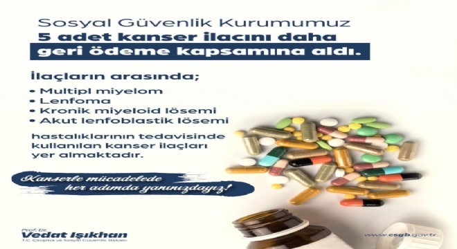 Bakan Işıkhan, sosyal medya hesabından yaptığı paylaşımda, "Sosyal Güvenlik Kurumumuzun düzenlemesiyle 5 kanser ilacını daha geri ödeme listesine aldık. İlaçların hastalarımıza şifa olmasını temenni eder, vatandaşlarımıza sağlıklı bir ömür dilerim" ifadelerini kullandı.