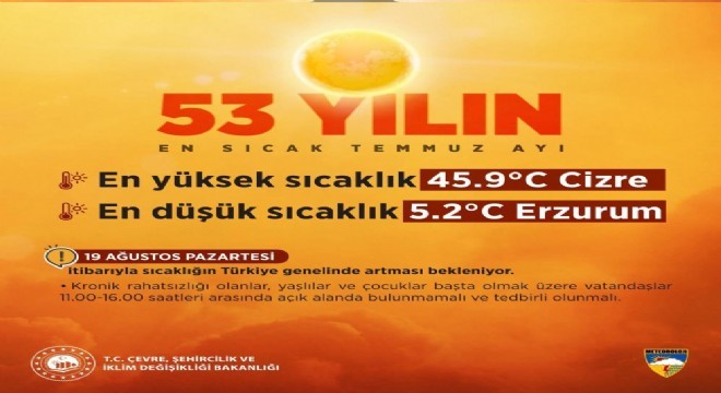 Çevre, Şehircilik ve İklim Değişikliği Bakanı Murat Kurum, sosyal medya hesabından yaptığı paylaşımda, "Meteoroloji Genel Müdürlüğümüzün verilerine göre son 53 yılın en sıcak Temmuz ayını yaşadık. En yüksek sıcaklık 45.9 derece ile Cizre’de, en düşük sıcaklık 5.2 derece ile Erzurum’da tespit edildi. Önümüzdeki hafta Pazartesi gününden itibaren de hava sıcaklıkları artmaya devam edecek. Bu nedenle vatandaşlarımızdan daha tedbirli olmalarını rica ediyorum" dedi.
