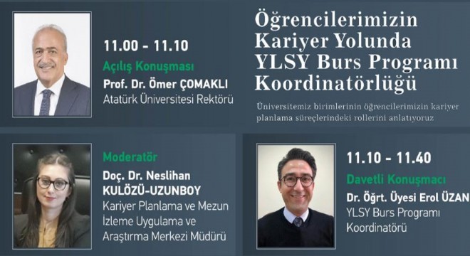 Öğrencilerin kariyerlerini şekillendirmeleri ve kendilerine en uygun yolu seçebilmelerine katkı sunmak amacıyla söyleşi programları düzenleyen Atatürk Üniversitesi Kariyer Planlama Mezun İzleme Uygulama ve Araştırma Merkezi (ATA KARMER) tarafından bu hafta, Yurt Dışına Lisansüstü Öğrenim Görmek Üzere Gönderecek Öğrencileri Seçme ve Yerleştirme (YLSY) Burs Programı Koordinatörlüğü ele alındı.