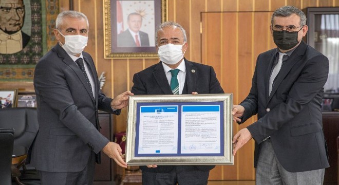 Rektörlük makamında Rektör Çomaklı ile bir araya gelen Dış İlişkilerden Sorumlu Rektör Yardımcısı Prof. Dr. Mustafa Sözbilir ile Dış İlişkiler Ofisi Koordinatörü Prof. Dr. Taşkın Öztaş ECHE Kalite Sertifikasını Rektör Prof. Dr. Ömer Çomaklı’ya takdim etti.