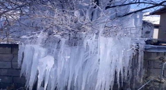 Erzincan’ın Çağlayan Beldesi Mertekli mahallesinde bir evin önünde bulunan çeşme arızalandı. Çeşmeden ağacın üzerine sıçrayan sular, soğuk havanın etkisi ile ağacın buz tutmasına neden oldu. Ağaçta kartpostallık görüntü oluşurken buz tutan ağacı gören vatandaşlar ise şaşkınlıklarını gizleyemedi. Ağcın üzerinde oluşan uzun buz sarkıtları ilginç görüntü oluştururken vatandaşlar ağacın buz kütlesine dönüştüğünü kaydetti.