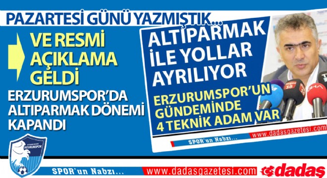Büyükşehir Belediye Erzurumspor’da Teknik Direktör Mehmet Altıparmak dönemi sona erdi.