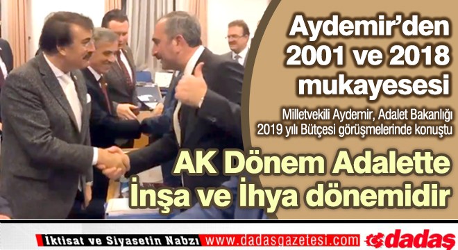 Plan ve Bütçe Komisyonu Adalet Bakanlığı 2019 yılı Bütçesi görüşmelerinde söz alan Milletvekili Aydemir, TBMM Plan ve Bütçe komisyonu tutanaklarında AK Parti öncesi, Kasım 2001 yılına ait olan ve o dönemdeki ülke adalet durumunu özetleyen bir pasajı aktararak, bugün gelinen mükemmel duruma vurgu yaptı. AK Parti dönemiyle birlikte gerçekleştirilen adalet odaklı yatırım, hizmet ve yapısal dönüşümü işaret ederek, ‘Bakın, ben size arkadaşlar, tuzun koktuğu zamanlardan bir aktarım yaptım, tuzun koktuğu zamanlar o zamanlardı. Tuzu tertemiz hâle getirdi bu ak kadro. ‘ kaydını düştü.