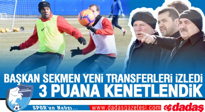 Erzurum Büyükşehir Belediye Başkanı ve Büyükşehir Belediye Erzurumspor'un Onursal Başkanı Mehmet Sekmen kulüp tesislerinde gerçekleşen antrenmanı izledi. Kulüp Başkanı Hüseyin Üneş ve Genel Sekreter Ünsal Kıraç’ın da izlediği antrenmanda Başkan Sekmen, yeni transferler Rashad Muhammed ve Pierre Kanstrup’a dikkat kesildi.