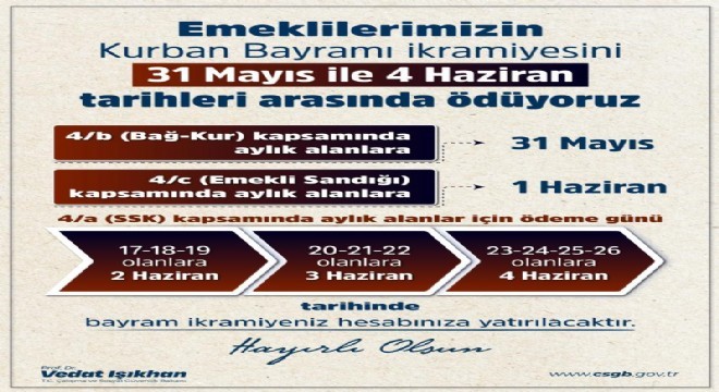 Bakan Işıkhan, sosyal medya hesabından yaptığı paylaşımda, "Emekli vatandaşlarımızın bayram ikramiyesi ödemeleri Kurban Bayramı öncesinde 31 Mayıs ile 4 Haziran tarihleri arasında banka hesaplarına yatırılacak. Emekli ve hak sahiplerimize toplamda 57,4 milyar lira bayram ikramiyesi ödemesi gerçekleştirilecek. 4 (b) (Bağ-Kur) kapsamında gelir/aylık alanların Kurban Bayramı ikramiyeleri 31 Mayıs tarihinde, 4 (c) (Emekli Sandığı) kapsamında aylık alanların Kurban Bayramı ikramiyeleri 1 Haziran tarihinde, 4 (a) (SSK) kapsamında gelir/aylık alanların Kurban Bayramı ikramiyeleri 2-3-4 Haziran tarihlerinde ödenecek" ifadelerini kullandı.