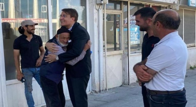 Milletvekili Aydemir’in, “o zaman seni bir öpeyim” diyerek Hasan Hüseyin amcaya sarılması üzerine bir anısını anlatan Hasan Hüseyin amca, “Hoca vaaz veriyordu, Erzincan’da. Benim çocuklarım oradaydı. Dedi ki, Cenab-ı Halık, Cebrail’i yollayarak demiş ki, 'Büyüğün kadirini bilen benim kadrimi bilir. O büyük kötü de dua etse, iyi de dua etse ikisini de kabul ederim, geri göndermem'” şeklinde dua etti.