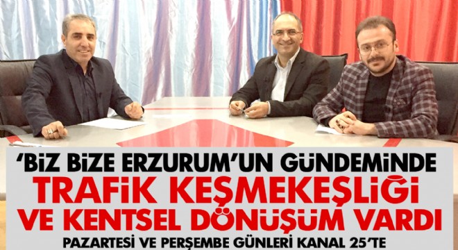 Kanal 25’te Pazartesi ve Perşembe günleri yayınlanan “Biz Bize Erzurum” adlı program son sürat devam ediyor. Naci Ergen’in hazırlayıp sunduğu, Gazeteniz DADAŞ’ın Genel Yayın Yönetmeni Mahmut Akdağ ve Nokta Medya Editörü Samet Özünal’ın yorumlarıyla katıldığı programda dün de kentsel dönüşüm, trafik çilesi ve şehirdeki denetim eksiklikleri ele alındı.