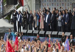 Davutoğlu, şunları söyledi: "12 yıl içinde ne tür badirelerden geçtik ama bizi durdurabildiler mi? Bu üç parti, arkasındaki paralel çete, onun arkasındaki DHKPC, Kandil ve uluslararası çeteler, Türkiye'nin yükselişini durdurabilirler mi? İşte hem insan onuruna, hem kudretli ve şefkatli bir geleceğe yürüyen AK Parti'yi durdurabilirler mi? Biz Ankara Meydanı'nda ne konuşuyorsak, yarın da Diyarbakır'dayız orada da aynı şeyi konuşuruz. Çanakkale'de aynı şeyi, Tekirdağ'da aynı şeyi konuşuruz. Milletle gönül dilinde konuşan kim? Bütün bu hizmetlerle, kendi vatandaşına şefkatle yaklaşan, dünyada her yerde al bayrağı dalgalandıran AK Parti kadroları, 2023'e yürüyor. "