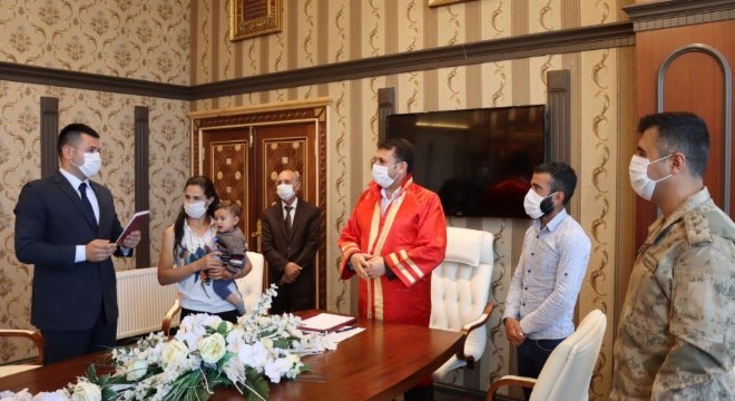 10 aylık oğullarıyla birlikte nikah masasına oturan genç çiftin nikahını Belediye Başkanı Melik Yaşar kıyarken, çiftin nikah şahitliklerini Çat Kaymakamı Mustafa Karali ve İlçe Jandarma Komutanı Jandarma Yüzbaşı Mehmet Karabulut yaptı.