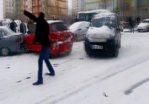 Erzurum’da kar yağışının ardından buzlanan yolda meydana gelen trafik kazaları kameraya yansıdı. Ağır kış şartlarının yaşandığı Erzurum’da buzlanan yollarda meydana gelen trafik kazaları kaçınılmaz oldu. Yakutiye ilçesi Hilalkent yokuşunda kara hazırlıksız yakalanan sürücüler birbiri ardına kaza yaptı. 8 otomobilin büyük hasar gördüğü kazalarda bir kişi de hafif yaralandı. Görüntüler bir cep telefonu kamerasıyla Yakutiye ilçesindeki Hilalkent semtinde çekildi. Geç gelen kara hazırlıksız yakalanan sürücüler yağışla birlikte buz pistine dönen yolda birbiri ardına kaza yaptılar. Önce kırmızı bir otomobil kaza yaptı. Yol kenarındaki otomobile arkadan çarpan kırmızı otomobilin sürücüsü kazanın şokuyla aracından çıkıp kaldırımda beklemeye başladı. Bu sırada bir başka otomobil direksiyon hakimiyetini kaybetti ve hızla kırmızı araca arkadan çarptı. O anlarda otomobilin yanında bekleyen iki kişi kaçarak kendilerini zor kurtardı. Ardından bir başka otomobil kayarak geldi ama son anda kazaya karışmaktan kurtuldu. Sonrasında bir cip hurdaya dönen otomobillerin içine daldı. Bir başka cip ise buzda adeta dans etti. Bu sırada duramayan bir otomobil yine kırmızı otomobile çarptı. Yaşanan bu kazalarda tam 8 otomobil büyük hasar gördü. Yol kenarında bekleyen bir yaya ise otomobilin kendisine çarpmasıyla hafif yaralandı.