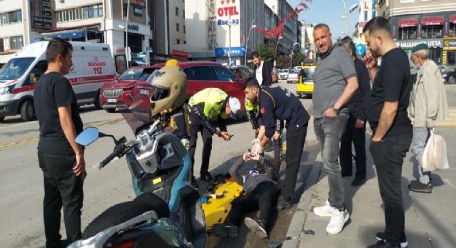 Yakutiye ilçesi Cumhuriyet Caddesi'nden önündeki taksiye çarpan motosiklet sürücüsü S.C., çarpışmanın etkisiyle yola savruldu. Trafik ekiplerinin hemen yakınında meydana gelen kazada 24 ABZ 713 plakalı motosiklet 25 TT 613 plakalı taksiye arkadan çarptı. Başında kask bulunan sürücü motosikletten düştü ve ilk müdahaleyi yakınlarda bulunan polis memurları yaptı. Bu arada 112 ekiplerine ihbar yapıldı. Ambülans gelinceye kadar yoldan geçen vatandaşlar meraklı gözlerle yolun ortasında yatan motosiklet sürücüsü S.C.'yi izlediği görüldü. Bu arada yaralı sürücünün de sürekli olarak cep telefonu ile konuşması ve ilgilenmesi gözlerden kaçmadı.