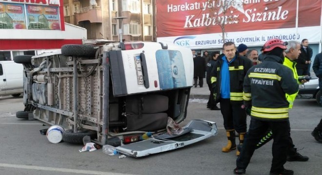Edinilen bilgiye göre, Erzurum Yakutiye Belediyesi DGM kavşağında meydana gelen trafik kazasında Yoncalık Caddesi’nden Medrese Caddesine seyreden 25 FF 522 plakalı cezaevi personelini taşıyan servis minibüsü ile Tebrizkapı semtinden Cumhuriyet Caddesine seyreden 81 FB 027 plakalı sebze yüklü minibüs çarpıştı.