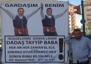 Muammer Polat’ın Başbakan’a hazırladığı afişteki yazılar şöyle: “Hoşgeldin dünya lideri Dadaş Tayyip baba, her an her zaman el ele, sökmez oyun sökmez hile, dünya bunu bilsin bele”