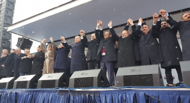 "Kişi sevdiğiyle beraberdir" Hadisi Şerifini hatırlatan Cumhurbaşkanı Erdoğan, "Kim kimle kol kola. CHP, HDP sözde İYİ Parti ve ne yazık ki Saadet Partisi. Dördü bir araya gelmişler. Kişi sevdikleriyle beraberdir. Söyle bana arkadaşını söyleyeyim sana kim olduğunu. Ya huyundan ya suyundan ya dilinden kapacak. CHP ile kol kola olan ne olacak? Onlar gibi olacak. Aynı şekilde İYİ Parti'yle, aynı şekilde HDP’yle. Bizim ittifakımızın adı Cumhur İttifakı. Nerede başladı? 15 Temmuz’da başladı. Yenikapı ruhuyla yürüyor. Pazara kadar değil mezara kadar. Erzurum 31 Mart'ta istikrarımıza, istiklalimize, istikbalimize göz dikenlere bir kez daha derslerini veriyor muyuz? 31 Mart'ta bir kez daha milli iradeye sahip çıkıyor muyuz? 31 Mart'ta bir kez daha tevazu samimiyet ve gayretle memleket işi gönül işi diyor muyuz? Gönül belediyeciliği diyor muyuz? Büyükşehir ve tüm ilçelerde Cumhur İttifakı ve AK Parti'li MHP’li adaylarımıza sahip çıkıyor muyuz? Maşallah. Kar boran fırtına benim Dadaşlarımı engellemiyor. İşte yine meydandasınız. Teşekküre geldiğimde inşallah temennim hava daha güzel olur" dedi.