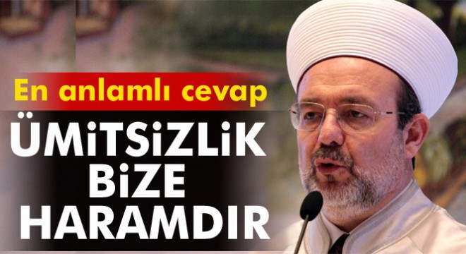 Terör örgütlerin asıl gayelerinden birinin de milletin umudunu yok etmek olduğunu vurgulayan Görmez, “Bu terör ve cinayet şebekelerinin çocuklarımızı katlederken insanlarımızı yok ederken hedeflerine koydukları ikinci gaye bu milletin umudunu yok etmek, hayata bağını koparmak, inancını, değerlerini, medeniyetini ve aidiyet duygusunu yok etmek. Oysa biz öyle bir inancın mensuplarıyız ki, ümitsizlik bize haramdır” diye konuştu. Görmez, terör örgütlerin üçüncü gayesinin ise, “bu milleti yeryüzündeki mazlumların, mağdurların umudu olmaktan çıkarmak” olduğunu belirterek, şunları kaydetti: