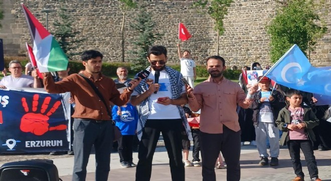 Erzurum Kalesi önünde toplanan grup, 81’inci haftada da zulme karşı seslerini çıkardılar ve yürümeye devam etti. Türk, Filistin ve Doğu Türkistan bayraklarının taşındığı gösteriye vatandaşlarda destek verdi.