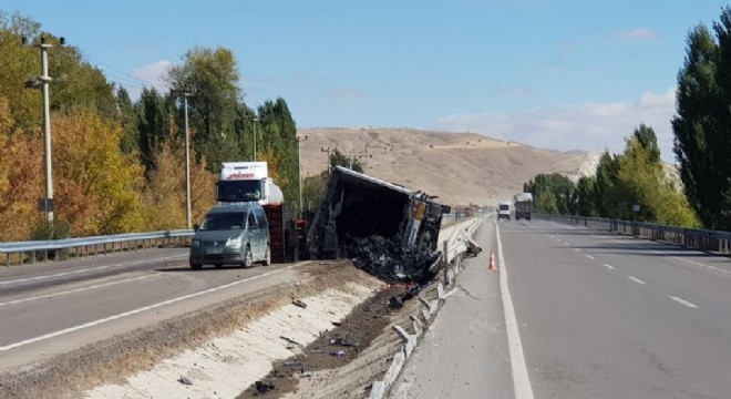 Aşkale ilçesinde direksiyon hakimiyetini kaybeden Tır yan yattı. Tır da yüklü domatesler karayoluna savruldu. Edinilen bilgiye göre, bugün sabah saatlerinde Erzurum'un Aşkale ilçesinde Erzincan’dan Erzurum istikametine seyir halindeki 07 ALJ 573 plakalı Domates yüklü TIR Aşkale Belediyesi Kır Düğün Salonu mevkiine geldiğinde sürücüsünün direksiyon hakimiyetini kaybetmesi sonucu orta refüje düşerek yan yattı. Tır yaklaşık 40 metre sürüklendikten sonra durabildi. Kazada sürücü N.C hafif yaralı olarak kurtulurken araçta büyük çapta maddi hasar oluştu. Kaza sonrası yola savrulan domatesler vatandaşlar tarafından toplandı.