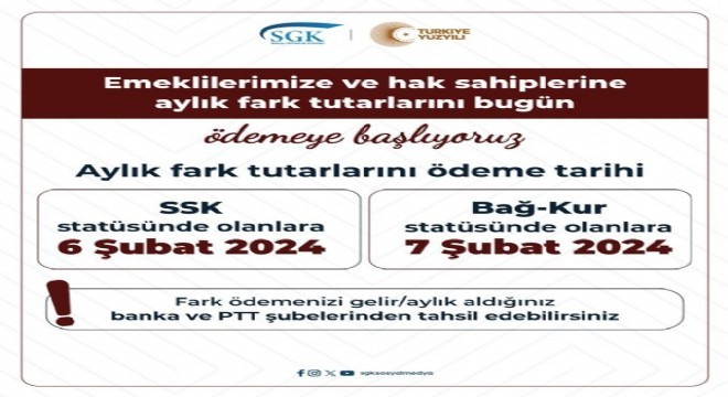 Bu çerçevede SSK ve BAĞ-KUR emeklilerine yapılan zamların farkları dün ödenmeye başladı. SSK emeklilerine yapılan zammın farkı  6 Şubat, Bağ-Kur emeklilerine yapılan zammın farkı ise 7 Şubat hesaplara yatacak.