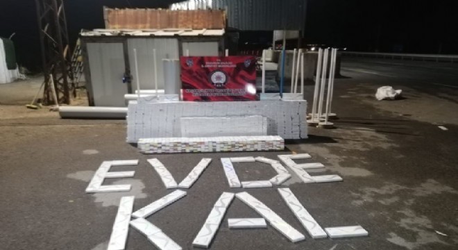 Erzurum’da polis kontrol noktasında durdurulan bir Tırda rulo halde sarılmış olan muşambaların içerisinde piyasa değeri 116 bin 750 lira olan 8 bin 850 paket kaçak sigara yakalandı. Polis ekipleri ele geçirdikleri sigaralarla “Evde Kal” yazarak öz çekim yaptı.