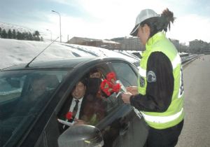 ERZURUM (İHA) - Erzurum’da trafik polisleri 14 Şubat Sevgililer Günü dolayısıyla sürücülere jest yaparak kırmızı karanfil dağıttı.