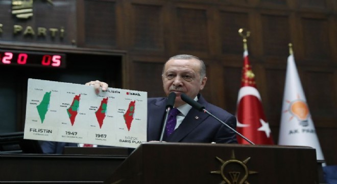 Amerikan yönetimin açıkladığı sözde Orta Doğu Barış Planına ilişkin konuşan Erdoğan,” Bu bir barış değil işgal ve ilhak planıdır. Açıklanan planın yegane hedefi 70 yıldır aralıksız süren İsrail’in işgal yıkım ve gasp politikalarına meşruiyet kazandırmaktır. Filistin toprakları 1947’li yıllarda neydi bugün ne?, Vicdani olmayan insani olmayan bir adım atıldı. Şimdi bu BM ‘de bunun tartışmalarını yapacağız. Fakat kendileri de birbirlerine düştü. Nancy Pelosi el sıkmıyor. O onun elini sıkmıyor. Konuşma metnini Pelosi bütün milletin huzurunda yırtıyor atıyor. Alma mazlumun ahını çıkar aheste aheste. 1947’de BM ‘lerin taksim planı var. İsrail’e oraları vermiş. 67’ye geliyoruz. Filistin çok daha küçülüyor. Geliyoruz şimdi düşünülene söz de barış planı yani işgal planı bu planda da görüldüğü gibi. Filistin yok. Onun dışındaki her yer sözde İsrail. Tam 70 yıldır evlerine kavuşma hasretiyle beklenen Filistinli mültecilerin geri dönüş hakkının olmayacağını söylüyor bu plan. Kendi topraklarına dönemeyecek. Bunlar işgalci. Demek ki Trump bu işgalcilerin arkasında duruyor. Kudüs ve Filistin’in göz göre göre İsrail’e peşkeş çekilmesini kim içine sindirebilir. Bırakın Müslümanları böyle bir planın Hristiyan ve aklı selim Museviler için bile biliyorsunuz araçların önünde yattılar Museviler. Ben aynı gün Haham başını ve cemaat liderini 5 kişilik heyet olarak kabul ettim. Bizde düşmanlık , kin, nefret yok. Bunların her yerinden kin nefret akıyor. Bunların eli savunmasız kadınlara kalkıyor, o sabilere , çocuklara kalkıyor. Yerlerde süründürüyorlar. Bunları hep birlikte izledik. Bunlar bu denli insanlıktan nasibini almamış tiplerdir. Türkiye olarak Filistin’i işgal Kudüs’ü gasp etme anlamına gelecek bu planı hemen reddettik tepkimizi açıkça ortaya koyduk. Ardından Filistin Devlet Başkanı Mahmut Abbas ile telefonda Hamas Lideri İsmail Heniyye ile İstanbul’da yüz yüze görüşerek Filistinli kardeşlerimizin yanında olduğumuzu gösterdik. Kimi Arap ülkerini de tavır değişikliğine zorladığını görüyoruz. Amerika gerek şahsıma gerek İstihbarat başkanıma yönelik Tehditler savuruyor. Daha da ileri Türkiye’deki bazı finans kuruluşlarını da tehdit altına alıyor. Ne yaparsanız yapın, bunu kesinlikle başaramayacaksınız. Filistin’de kadınlarn direnişi karşısında bize düşen en az onların direnişi kadar dik durmaktır. Bunu başarmamız lazım. Çok büyük paraları, silahları olabilir, nükleer başlıklı silahları da olabilir. Biz şunu biliyoruz. Nice az inanmış toplulukları, inanmamış kalabalıkların üzerine galip kıldık diyor" şeklinde konuştu.