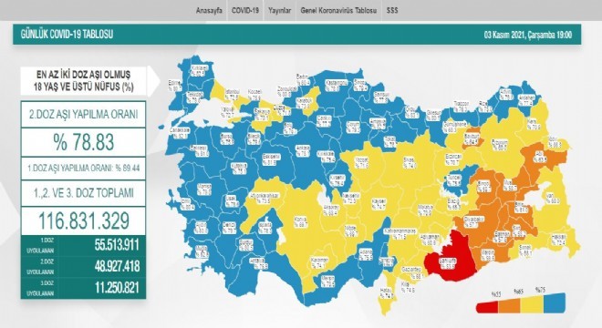 Verilerde, aşılamada önde giden illere de yer verildi. Bakanlığın tablosuna göre yüzde 82,9 ile Türkiye'de en çok aşılamanın gerçekleştirildiği Ordu’yu Amasya, Muğla, Kırklareli, Osmaniye, Çanakkale, Eskişehir, Balıkesir, Zonguldak ve Edirne takip etti.